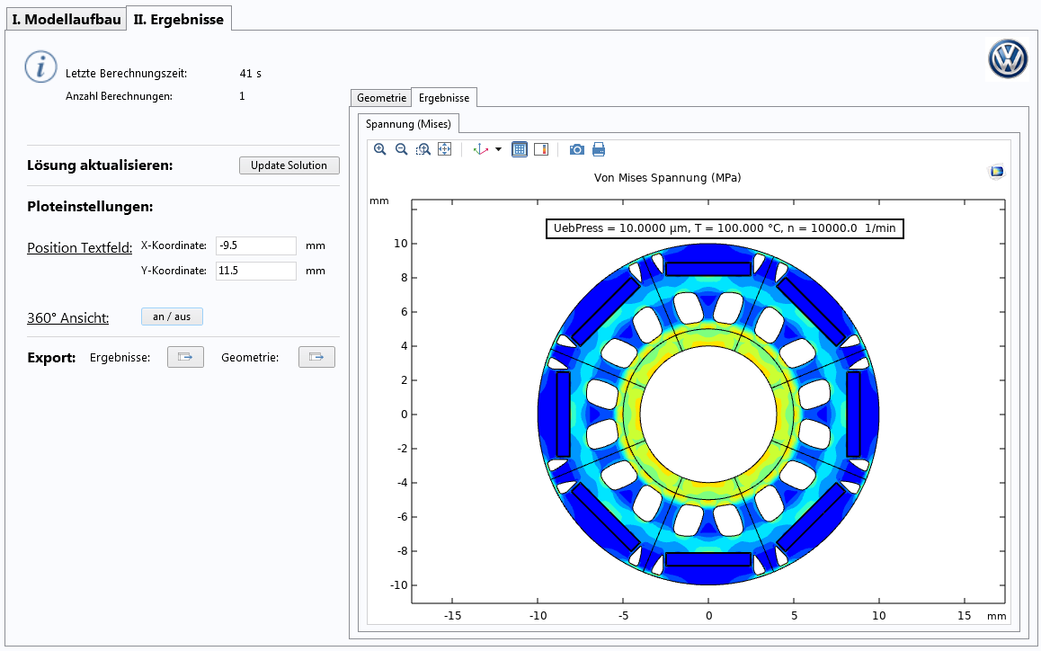 As essential components in electric drives, rotors need to be tested for durability, since they must endure a very large number of revolutions at varying speed and torque during drive operation. However, evaluating the strength of rotor laminations is time consuming. VW Kassel is automating this test process for rotors, as well as reducing development costs and increasing product quality, by building simulation applications with the COMSOL Multiphysics® software.
